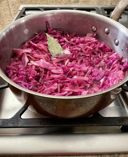 I made this with Roasted Pork Tenderloin, a classic pairing with cabbage in Germany and Austria. The leftover braised cabbage I mixed, about 1/4 cup or so, into leafy green salads.