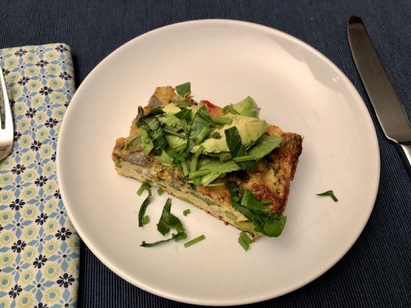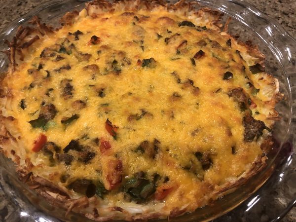 Frozen hash browns are a helpful staple. Just remember to defrost them first. Mix hash browns into the mixture OR use them as a crust like a quiche (my preference) and pour your egg mixture over it.