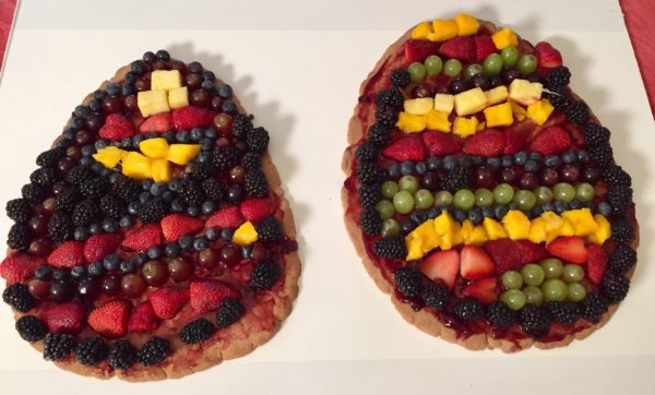 This Easter menu brings together the magnificence of spring foods — roasted asparagus with lemon zest zing, bright green sugar snap peas with mint & purple potatoes, roasted salmon , a salad harmoniously balancing piquant arugula and luscious strawberries. A glorious finale of beloved sugar cookie shaped as an egg, covered with colorful fruit. A delicious, nutritious way to honor Easter day celebrating nature’s bounty.