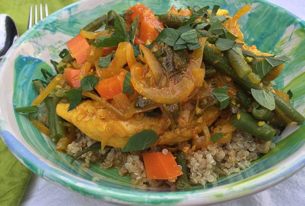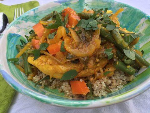 Tagine is traditionally a stand-alone one-dish entrée served with Moroccan bread on the side to be used as a utensil to scoop up the stew, but I like to serve tagine over couscous (whole-wheat or pearl couscous) or quinoa.